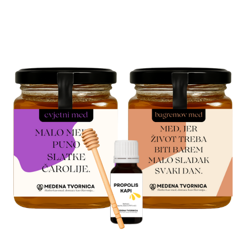 Spoj blagih i punih okusa meda s prirodnim propolisom čini ovaj paket savršenim darom za svakodnevnu dozu energije i slatkoće.